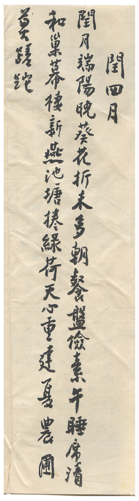 | 描述-摘要 | 閏月端陽晚。葵花折未多。朝餐盤儉素。午睡席清和。巢幕棲新燕。池塘捲綠荷。天心重建夏。農圃莫蹉跎。 |