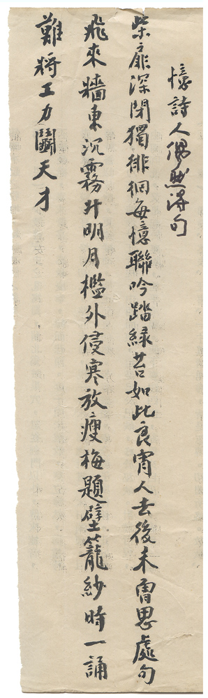 | 描述-摘要 | 柴扉深閉獨徘徊。每憶聯吟踏綠苔。如此良宵人去後。未曾思處句飛來。牆東沉霧升明月。檻外侵寒放瘦梅。題壁籠紗時一誦。難將工力鬬天才。 |