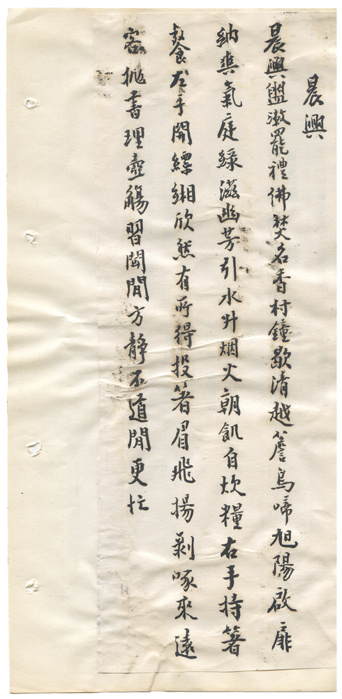 | 描述-摘要 | 晨興盥漱罷。禮佛焚名香。村鐘歇清越。簷鳥啼旭陽。啟扉納爽氣。庭綠滋幽芳。引水升烟火。朝飢自炊糧。右手持箸餐。左手開縹緗。欣然有所得。投箸眉飛揚。剝啄來遠客。拋書理壺觴。習聞閒方靜。不道閒更忙。 |