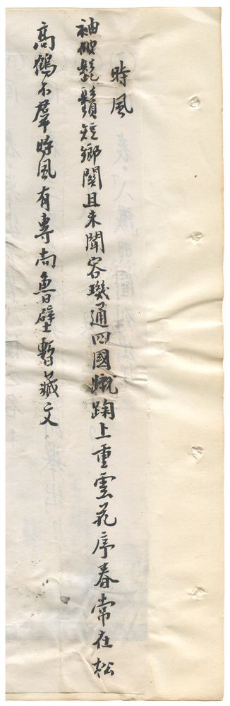 | 描述-摘要 | 袖破髭鬚短。鄉關且未聞。容璣通四國。蹴踘上重雲。花序春常在。松高鶴不群。時風有專尚。魯壁暫藏文。 |