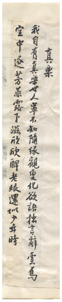 | 描述-摘要 | 我自有真樂。世人寧不知。隨緣觀變化。欲語拙言辭。雲鳥空中逐。芳菲露下滋。欣欣醒老眼。還似少年時。 |
