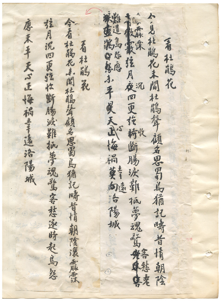 | 描述-摘要 | 今看杜鵑花。未聞杜鵑聲。顧名思蜀鳥。猶記疇昔情。朝陰瀼霡霂。弦月沉(夜)四更。強收(持)斷腸淚。難抵夢魂驚。客愁逐時起(老難遣)。鳥怨應未平。天心正悔禍。幸遠(莫向)洛陽城。今看杜鵑花。未聞杜鵑聲。顧名思蜀鳥。猶記疇昔情。朝陰瀼霡霂。弦月沉四更。強收斷腸淚。難抵夢魂驚。客愁逐時起。鳥怨應未平。天心正悔禍。幸遠洛陽城。 |