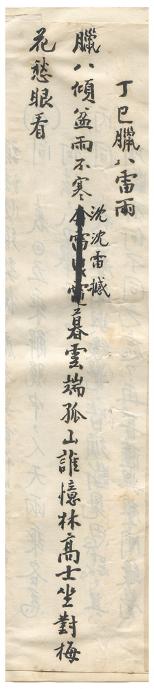 | 描述-摘要 | 臘八傾盆雨不寒。(?雷?電)沈沈雷憾暮雲端。孤山誰憶林高士。坐對梅花愁眼看。 |