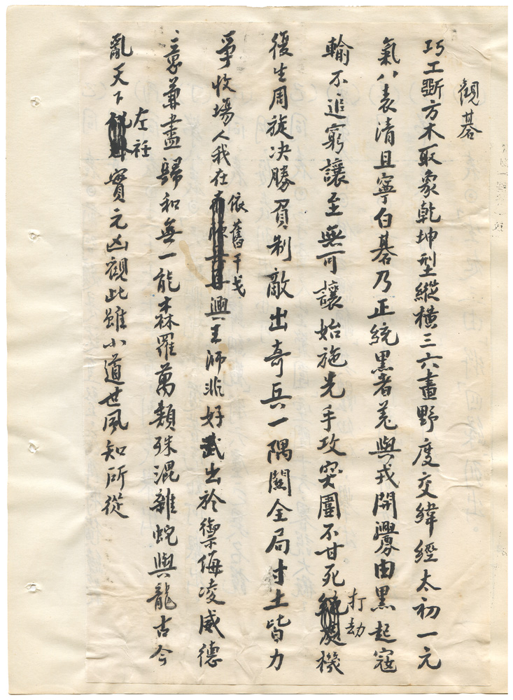 | 描述-摘要 | 巧工斲方木。取象乾坤型。縱橫三六畫。野度交緯經。太初一元氣。八表清且寧。白碁乃正統。黑者羌與戎。開釁由黑起。寇輸不追窮。讓至無可讓。始施先手攻。突圍不甘死。打劫(絕處)機復生。周旋决勝負。制敵出奇兵。一隅關全局。寸土皆力爭。收場人我在。依舊干戈興。王師非好武。出於禦侮凌。威德意兼盡。歸和無一能。森羅萬類殊。混雜蛇與龍。古今亂天下。左衽實元凶。觀此雖小道。世風知所從。 |