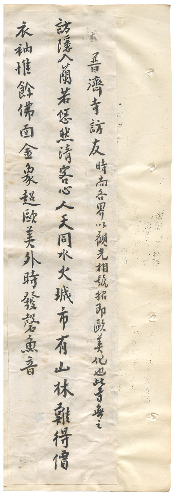 | 描述-摘要 | 訪隱入蘭若。悠然清客心。人天同水火。城市有山林。竹院(?得)僧皆(衣)衲。香龕(惟餘)佛獨(?)金。象超歐美外。時發磬魚音。 |