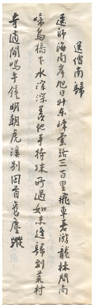 | 描述-摘要 | 送師海南岸。旭日升東峰。雲路三百里。飛車若游龍。林間尚啼鳥。橋下水淙淙。羨他手持珠。所過如未逢。歸到荒村寺。適聞鳴午鐘。明朝虎溪別。回首舊塵蹤。 |