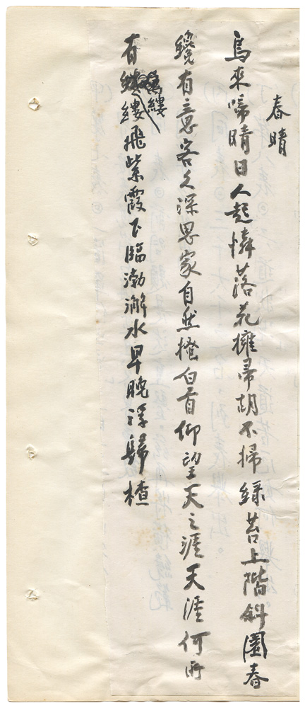 | 描述-摘要 | 鳥來啼晴日。人起憐落花。擁帚胡不掃。綠苔上階斜。園春纔有意。客久深思家。自然搔白首。仰望天之涯。天涯何所有。縷縷飛紫霞。下臨渤澥水。早晚浮歸楂。 |