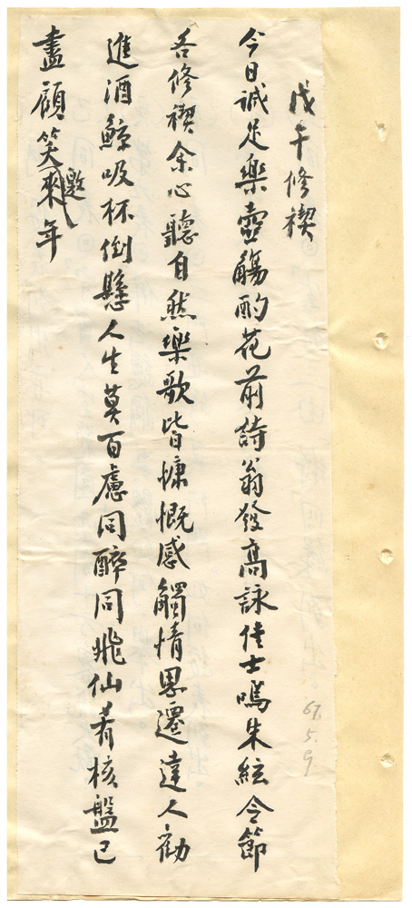 | 描述-摘要 | 今日誠足樂。壺觴酌花前。詩翁發高詠。佳士鳴朱絃。令節各修禊。余心聽自然。樂歌皆慷慨。感觸情思遷。達人勸進酒。鯨吸杯倒懸。人生莫百慮。同醉同飛仙。肴核盤已盡。顧笑邀來年。 |