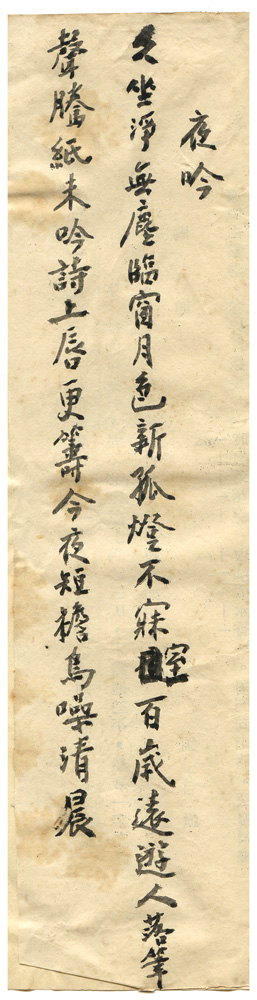 | 描述-摘要 | 久坐淨無塵。臨窗月色新。孤燈不寐室。百歲遠遊人。落筆聲騰紙。未吟詩上唇。更籌今夜短。檐鳥噪清晨。 |