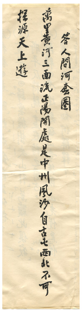 | 描述-摘要 | 萬里黃河三面流。正陽開處是中州。風沙自古屯西北。不可探源天上遊。 |