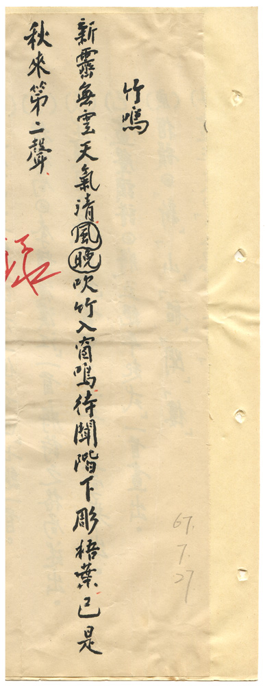 | 描述-摘要 | 新霽無雲天氣清。晚風吹竹入窗鳴。待聞階下彫梧葉。已是秋來第二聲。 |