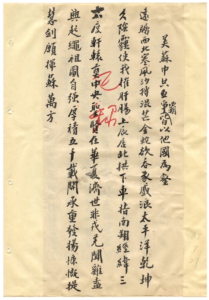 | 描述-摘要 | 遠矚西北塞。風沙摶混芒。金蛇欲吞豕。蹙浪太平洋。乾坤久陰霾。使我摧肝腸。上辰居北拱。下車指南翔。經緯三六度。軒轅奠中央。聖賢在華夏。濟世非戎羌。聞雞盍興起。繩祖圖自強。厚積五千載。開承重發揚。慷慨提慧劍。願揮蘇萬方。 |