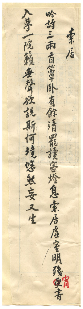 | 描述-摘要 | 吟詩三兩首。簟臥有餘清。罷讀客燈息。索居虛室明。殘宵(更)書入夢。一院籟無聲。欲說斯何境。悠然妄又生。 |
