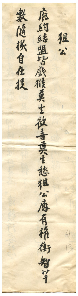 | 描述-摘要 | 廢約結盟皆戲猴。莫生歡喜莫生愁。狙公應有權衡智。芋數隨機自在投。 |