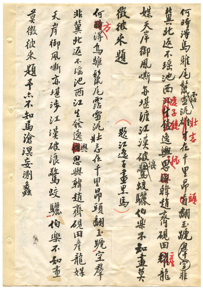| 描述-摘要 | 何方得烏騅。鬣尾霑雪泥。壯志在千里。昂頭翻玉蹏。空羣非冀北。返不瑶池西。江生發(逸子鏡)逸興。(極)思與韓趙齊。硯田產(耀)龍媒。天岸御風嘶。亦堪涉(渡)江漢。破浪驚蛟驪。伯樂不知畫。莫徵彼來題。予亦不知馬。滄溟妄測蠡。 |