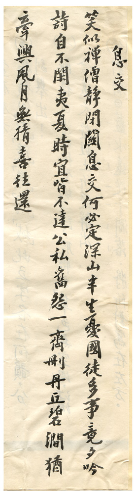| 描述-摘要 | 笑似禪僧靜閉關。息交何必定深山。半生憂國徒多事。竟夕吟詩自不閑。夷夏時宜皆未(不)達。公私舊怨一齊刪。丹丘碧澗猶牽興。風月無猜喜往還。 |