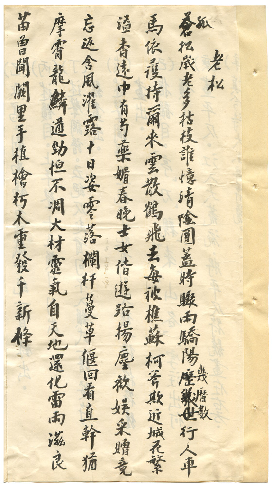 描述-摘要 | 孤松歲老多枯枝。誰憶清陰圓蓋時。驟雨驕陽幾曆數。行人車馬依護持。爾來雲散鶴飛去。每被樵蘇柯斧欺。近城花繁溢香遠。中有芍藥媚春晚。士女偕遊路揚塵。歡娛采贈竟忘返。含風濯露十日姿。零落欄杆蔓草偃。回看直幹猶摩霄。龍鱗遒勁恒不凋。大材靈氣自天地。還化雷雨滋良苗。曾聞闕里手植檜。朽木重發千新條。 |