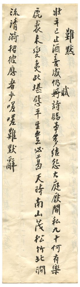 | 描述-摘要 | 壯年已止酒。善感仍賦詩。臨事多結怨。大庭厭聞私。九十何有樂。鹿裘未變夷。此堪慰平生。豈必葛天時。南山茂松竹。北澗流清漪。招彼應者少。嗟嗟難黙辭。 |