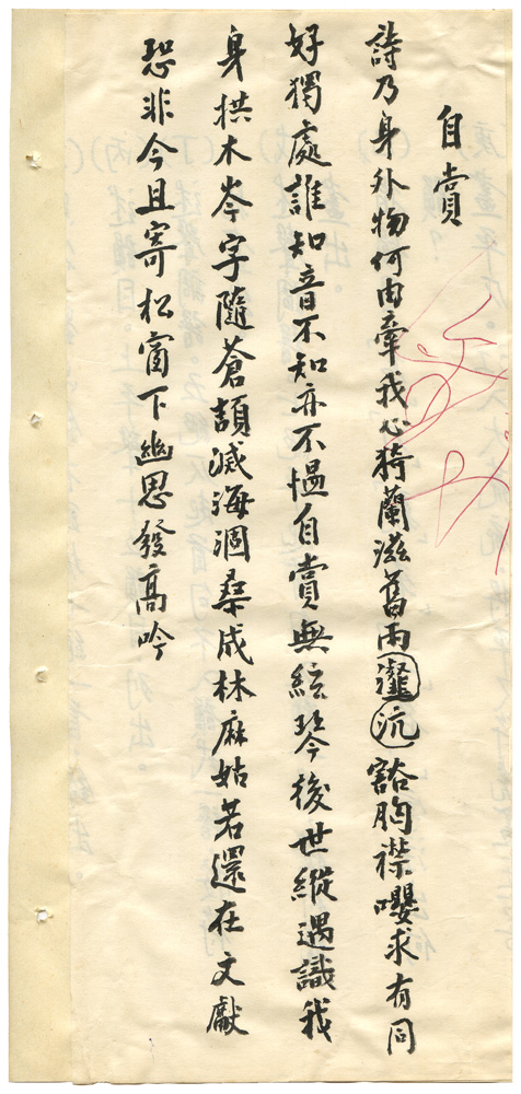 | 描述-摘要 | 詩乃身外物。何由牽我心。猗蘭滋舊雨。沆瀣豁胸襟。嚶求有同好。獨處誰知音。不知亦不慍。自賞無絃琴。後世縱遇識。我身拱木岑。字隨蒼頡滅。海涸桑成林。麻姑若還在。文獻恐非今。且寄松窗下。幽思發高吟。 |