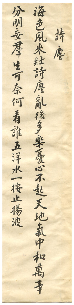 | 描述-摘要 | 海色風來壯。詩塵亂後多。樂憂心不起。天地氣中和。萬事分明妄。群生可奈何。看誰五洋水。一按止揚波。 |