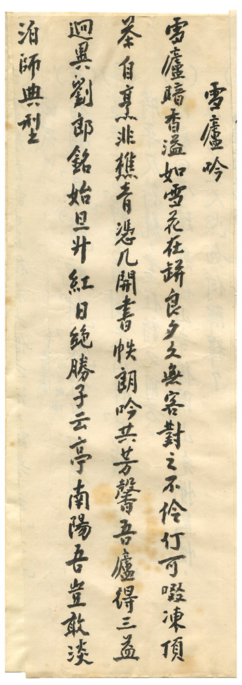 描述-摘要 | 雪廬暗香溢。如雪花在缾。良夕久無客。對之不伶仃。可啜凍頂茶。自烹非樵青。憑几開書帙。朗吟共芳馨。吾廬得三益。迥異劉郎銘。始旦升紅日。絕勝子雲亭。南陽吾豈敢。淡泊師典型。 |