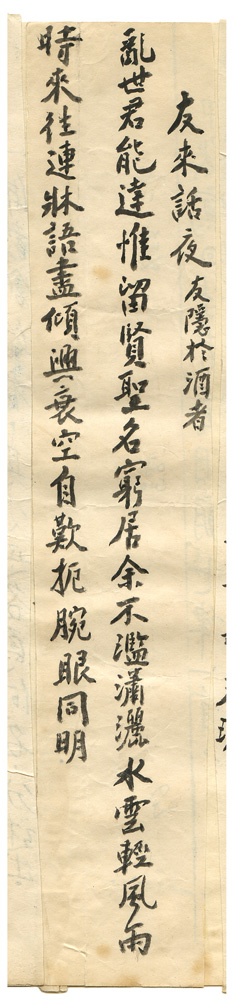 | 描述-摘要 | 亂世君能達。惟留賢聖名。窮居余不濫。瀟灑水雲輕。風雨時來往。連牀語盡傾。興衰空自歎。扼腕眼同明。 |