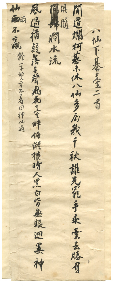 | 描述-摘要 | 聞道爛柯碁未休。八仙多局幾千秋。誰先罷手乘雲去。勝負俱隨澗水流。 |