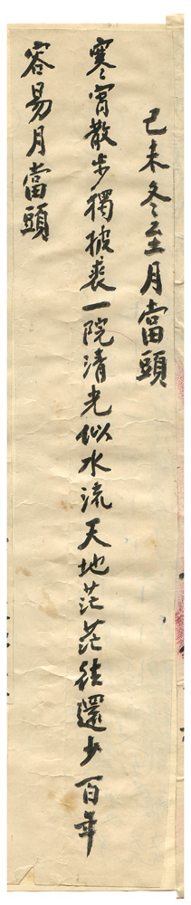 | 描述-摘要 | 寒宵散步獨披裘。一院清光似水流。天地茫茫往還少。百年容易月當頭。 |