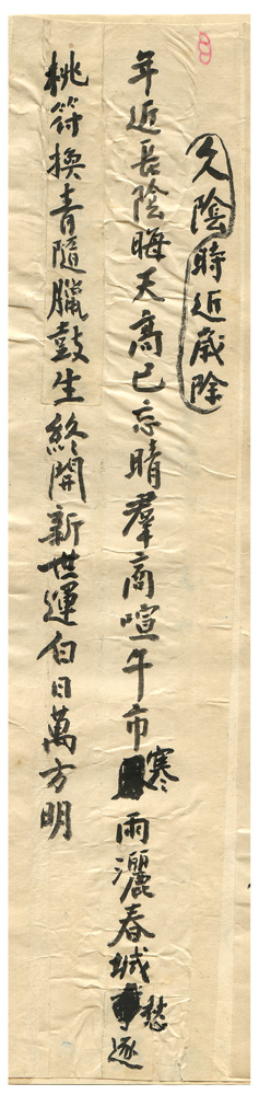 | 描述-摘要 | 年近長陰晦。天高已忘晴。群商喧午市。寒雨灑春城。愁逐桃符換。青隨臘鼓生。終開新世運。白日萬方明。 |