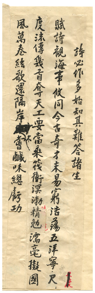 | 描述-摘要 | 賦詩觀海事攸同。今古奇才未易窮。浩蕩五洋寧尺度。流傳幾首奪天工。要當乘筏衝溟渤。精勉濡毫擬國風。萬卷絃歌還隔岸。不嘗鹹味總虧功。 |