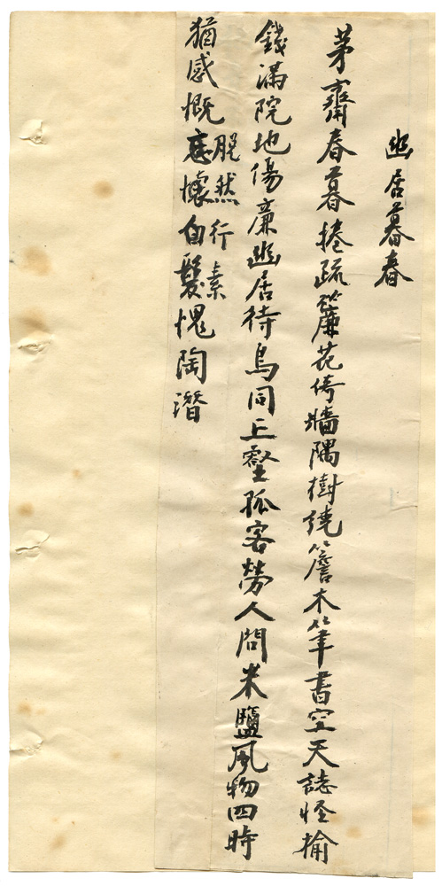 | 描述-摘要 | 茅齋春暮捲疏簾。花倚牆隅樹繞簷。木筆書空天誌怪。榆錢滿院地傷廉。幽居待鳥同〔丘-|〕壑。孤客勞人問米鹽。風物四時猶感慨。脫然行素愧陶潛。 |