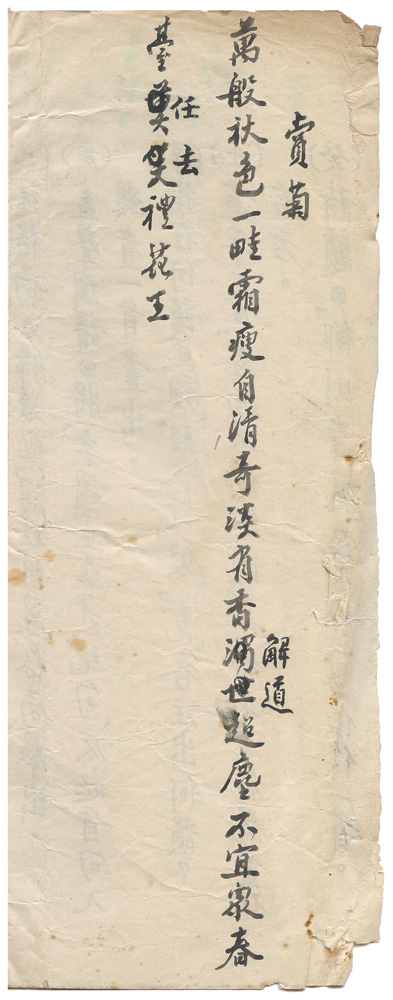 | 描述-摘要 | 萬般秋色一畦霜。瘦自清奇淡有香。解道超塵不宜眾。春臺任去禮花王。 |