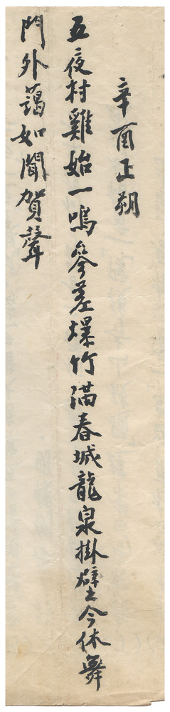 | 描述-摘要 | 五夜村雞始一鳴。參差爆竹滿春城。龍泉掛壁今休舞。門外藹如聞賀聲。 |