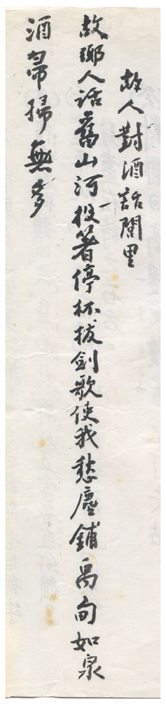 | 描述-摘要 | 故鄉人話舊山河。投箸停杯拔劍歌。使我愁塵鋪禹甸。如泉酒帚掃無多。 |