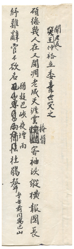 | 描述-摘要 | 碩德幾人在。又聞凋老成。天涯雲掩翳。客袖淚縱橫。報國長紓難。辭官不欲名。猶疑巴峽夜。煙雨杜鵑聲。(五十年前同寓巴山) |