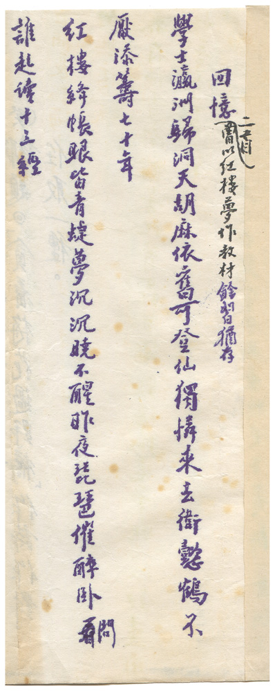 | 描述-摘要 | 紅樓絳帳眼皆青。蜨夢沉沉曉不醒。昨夜琵琶催醉臥。問誰起讀十三經。 |