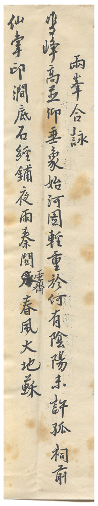 | 描述-摘要 | 雙峰高並仰。垂象始何圖。輕重於何有。陰陽未許孤。祠前仙掌印。澗底石經鋪。夜雨秦關霽。春風大地蘇。 |