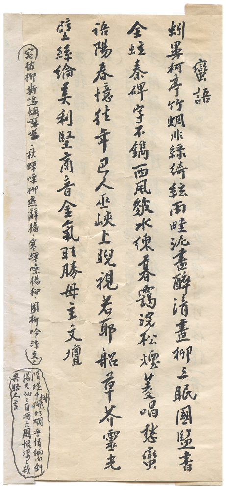 | 描述-摘要 | 蚓異柯亭竹。蜩非綠綺絃。雨畦泥盡醉。清晝柳三眠。國監書全蛀。秦碑字不鐫。西風皴水練。暮靄浣松煙。菱唱愁蠻語。陽春憶往年。巴人巫峽上。睨視若耶船。草芥靈光壁。絲綸美利堅。商音金氣旺。勝母主文壇。 |