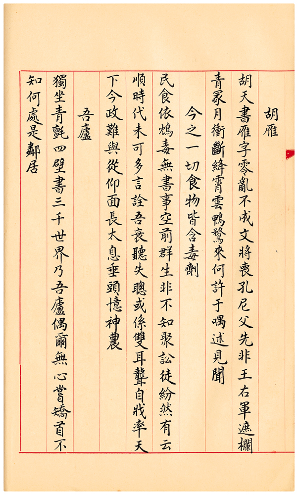 | 描述-摘要 | 民食依鴆毒。無書事空前。群生非不知。聚訟徒紛然。有云順時代。未可多言詮。吾衰聽失聰。或係雙耳聾。自戕率天下。今政難與從。仰面長太息。垂頭憶神農。 |