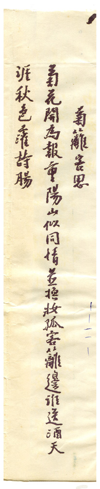 | 描述-摘要 | 菊花開為報重陽。山似同情並換妝。孤客籬邊誰送酒。天涯秋色灌詩腸。 |