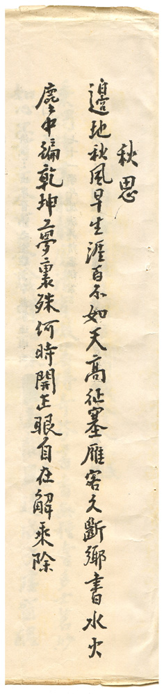 | 描述-摘要 | 邊地秋風早。生涯百不如。天高征塞雁。客久斷鄉書。水火塵中徧。乾坤夢裡殊。何時開正眼。自在解乘除。 |