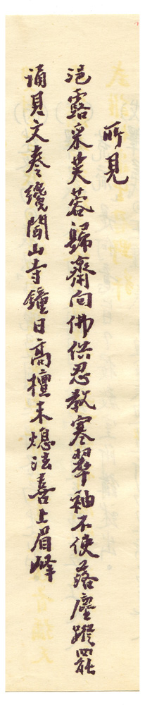 | 描述-摘要 | 浥露采芙蓉。歸齋向佛供。忍教寒翠袖。不使落塵蹤。罷誦貝文卷。纔聞山寺鐘。日高檀未熄。法喜上眉峰。 |