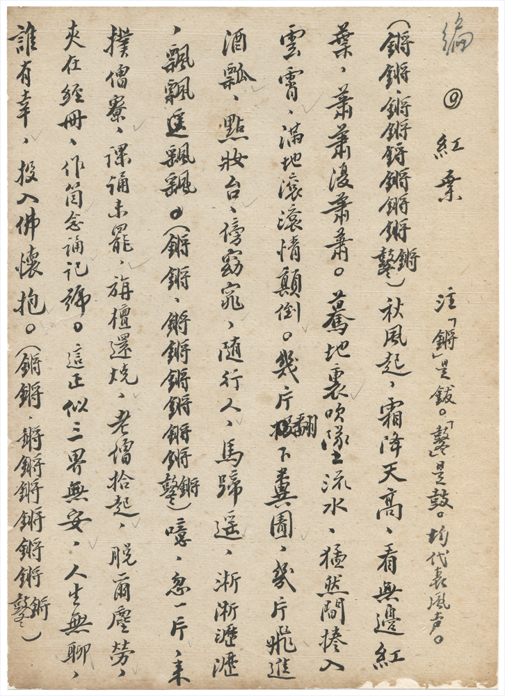 | 描述-摘要 | 秋風起 霜降天高 看無邊紅葉 蕭蕭復蕭蕭 驀地裏 吹墜之流水 猛然間捲入雲霄 滿地滾滾 情顛倒 幾片翻下糞圊 幾片飛進酒瓢 點妝台 傍窈窕 隨行人 馬跡遙 淅淅瀝瀝 飄飄飄飄 噫 忽一片來撲僧寮 課誦未罷 旃檀還燒 老僧拾起 脫爾塵勞 夾在經冊 作箇念誦記號 這正似三界無安 人生無聊 誰有幸 投入佛懷抱(洪金龍作曲) |