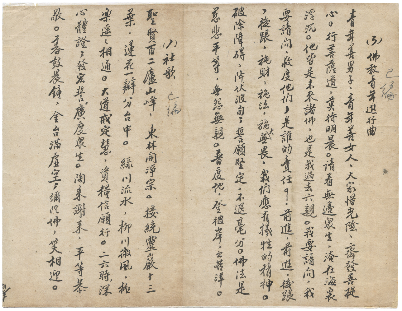 | 描述-摘要 | <佛教青年進行曲>(張亦作曲)青年善男子 青年善女人 大家惜光陰 齊發菩提心 行菩薩道 莫待明晨 請看無邊眾生 淹在海裏浮沉 他皆是未來諸佛 也是我過去六親 我要請問 我要請問 救度他們是誰的責任 前進 前進 後跟 後跟 施財施法施大無畏 我們應有犧牲的精神 破除障礙降伏波旬 誓願堅定不退毫分 佛法是慈悲平等無怨無親 普度他登彼岸出苦津 <社歌>(李明訓作曲)聖賢百二廬山峰 東林開淨宗 接統靈巖十三葉 蓮花一瓣分臺中 綠川流水 柳川微風 極樂遙遙 相通相通 大道戒定慧 資糧信願行二六時 深心體證 發宏誓 廣度眾生 陶來謝來 平等恭敬 暮鼓晨鐘 金臺滿虛空 彌陀佛 笑相迎 笑相迎 |
