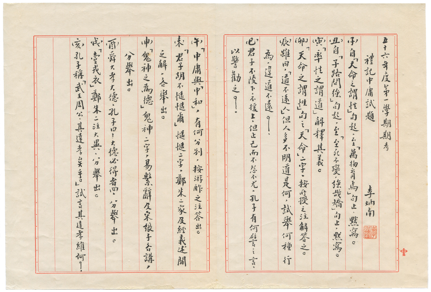 | 件名 | 五十六年度第一學期期考禮記中庸試題 |